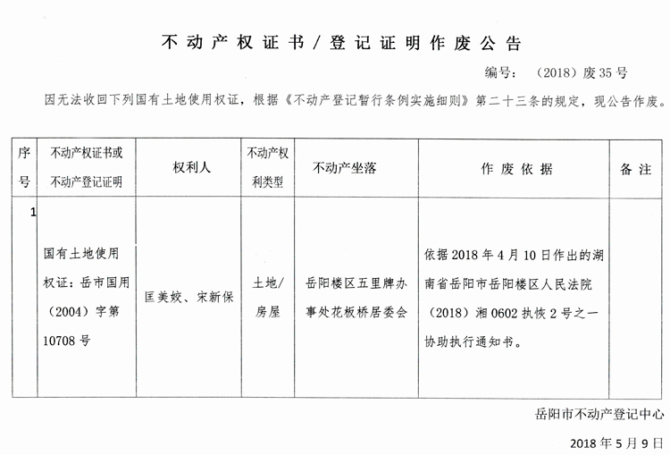 不动产权证书/登记证明作废公告 编号:(2018)废35号