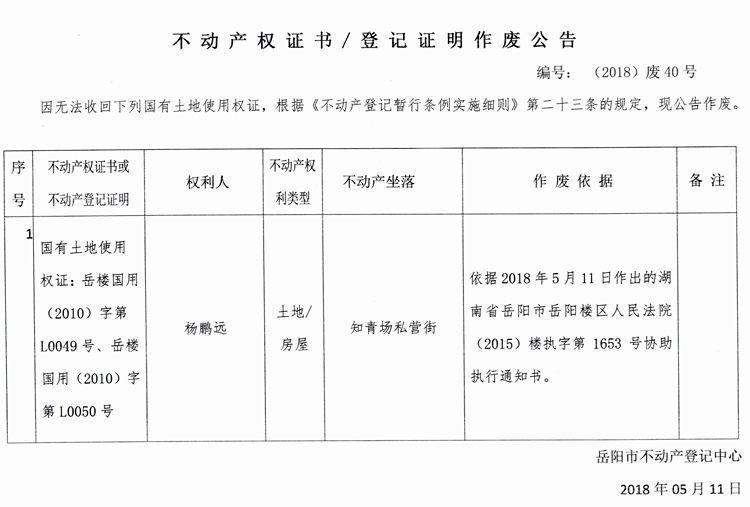 不动产权证书/登记证明作废公告 编号:(2018)废40号
