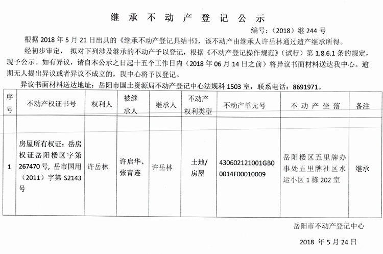 继承不动产登记公示 编号:(2018)继244号