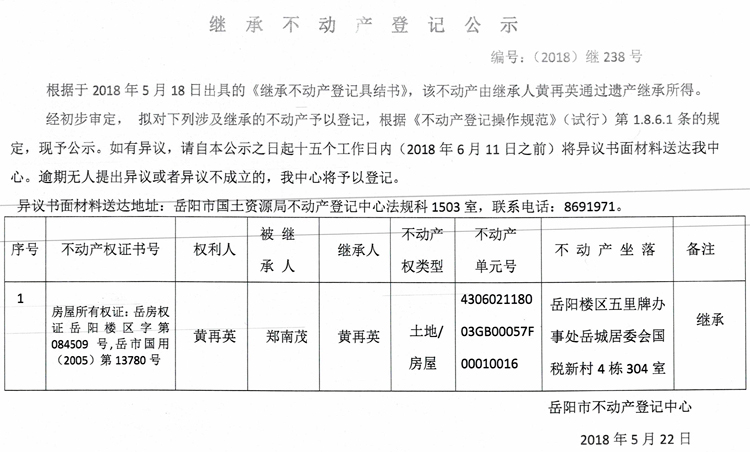 继承不动产登记公示 编号:(2018)继238号