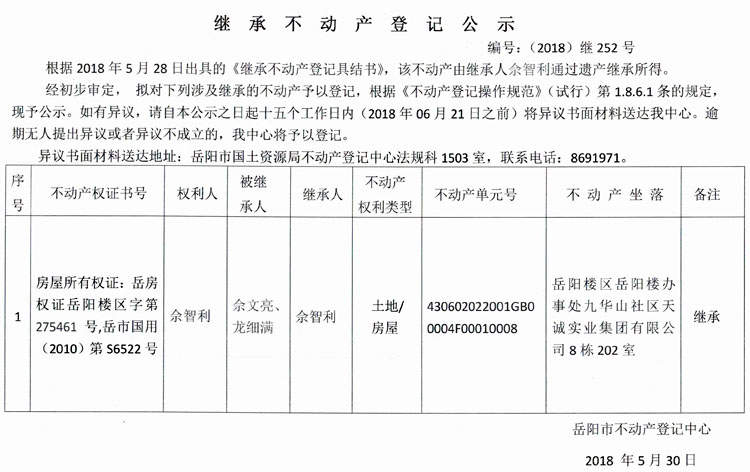 继承不动产登记公示 编号:(2018)继252号