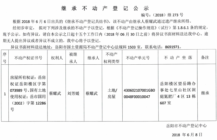 继承不动产登记公示 编号:(2018)继273号