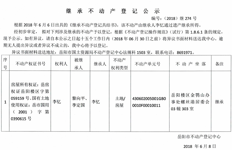 继承不动产登记公示 编号:(2018)继274号