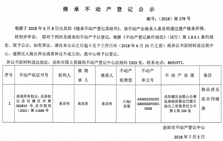 继承不动产登记公示 编号:(2018)继278号(易岳明)