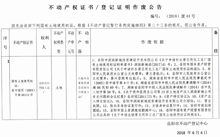 不动产权证书/登记证明作废公告 编号:(2018)废44号