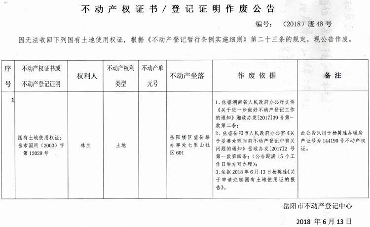 不动产权证书/登记证明作废公告 编号:(2018)废48号