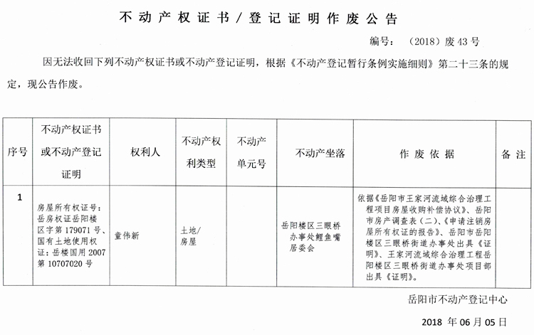 不动产权证书/登记证明作废公告 编号:(2018)废43号