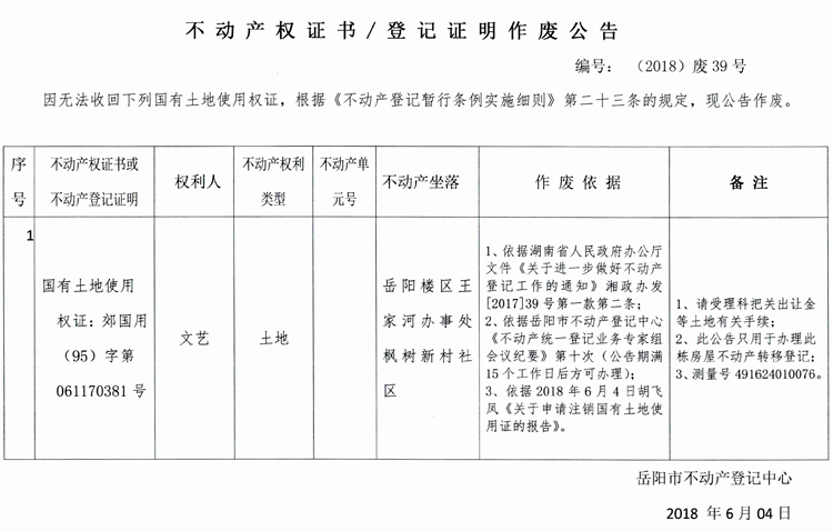 不动产权证书/登记证明作废公告 编号:(2018)废39号