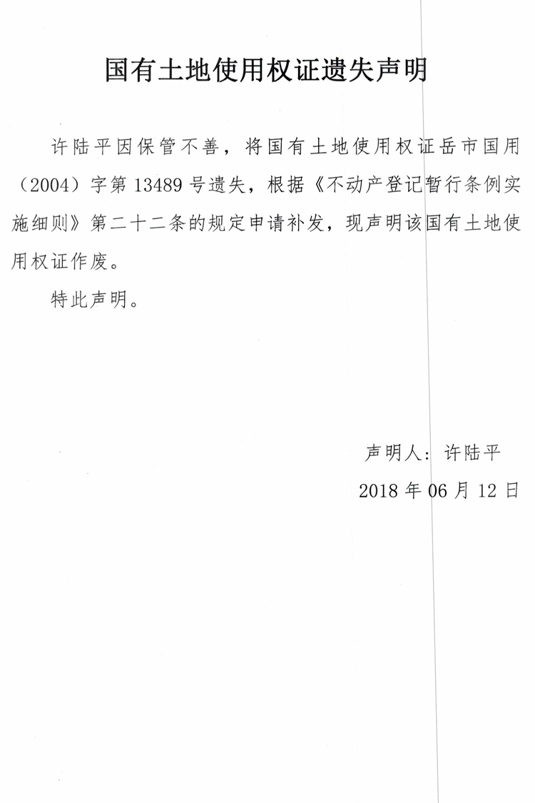 国有土地使用权证遗失声明(许陆平)