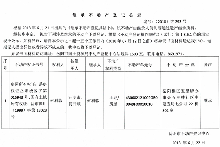 继承不动产登记公示 编号:(2018)继293号