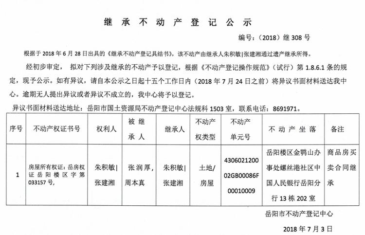 继承不动产登记公示 编号:(2018)继308号(朱积敏, 张建湘)