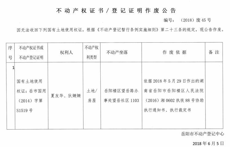 不动产权证书、登记证明作废公告 编号:(2018)废45号