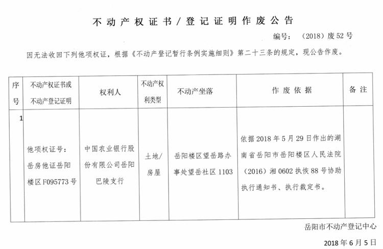 不动产权证书、登记证明作废公告 编号:(2018)废52号