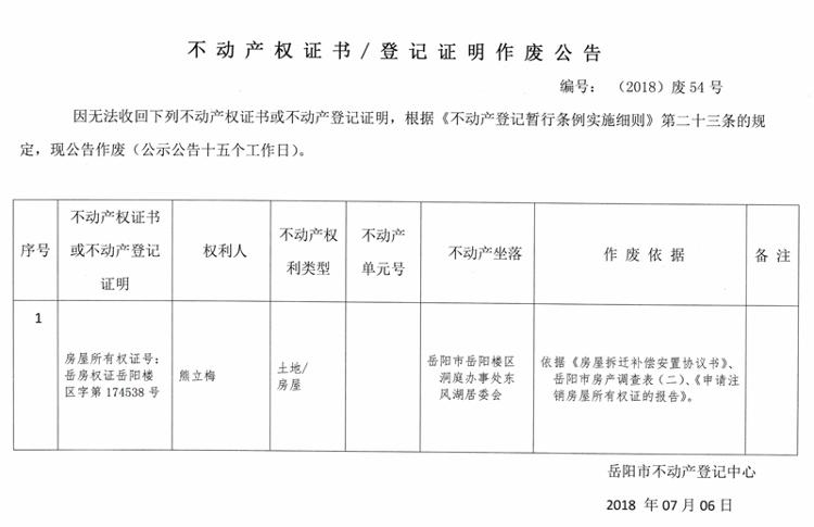 不动产权证书、登记证明作废公告 编号:(2018)废54号