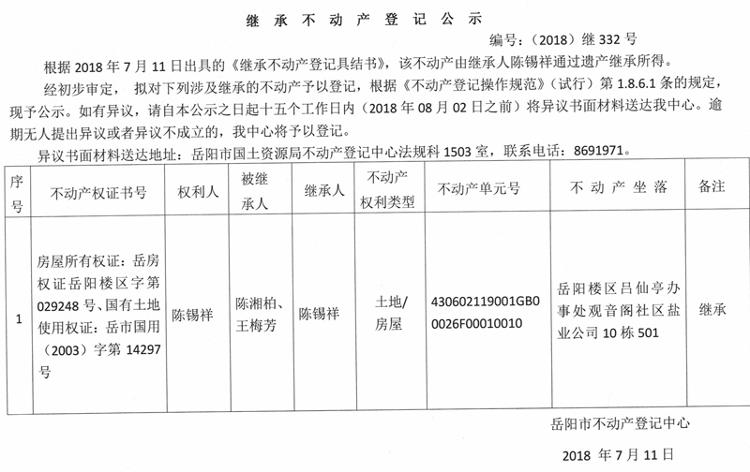 继承不动产登记公示 编号:(2018)继332号
