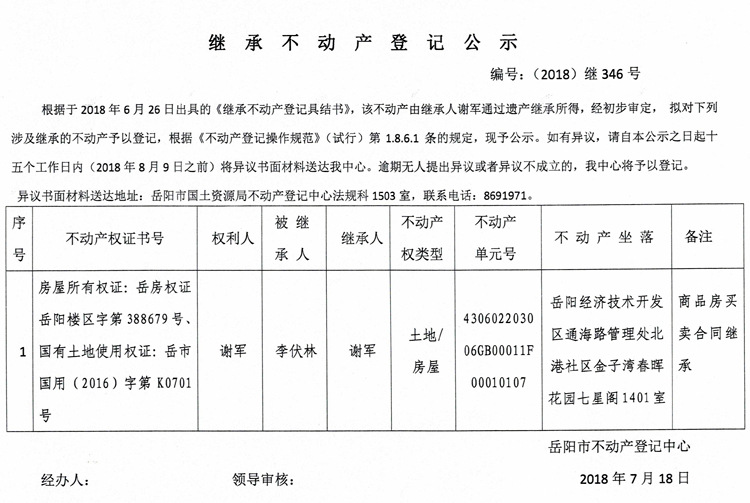 继承不动产登记公示 编号:(2018)继346号