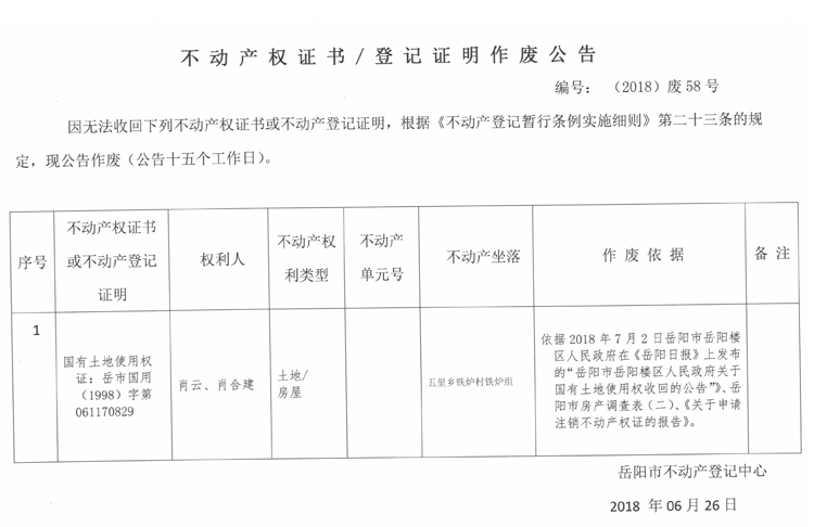 不动产权证书、登记证明作废公告 编号:(2018)废58号