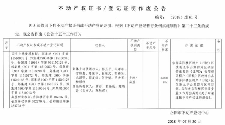 不动产权证书、登记证明作废公告 编号:(2018)废61号