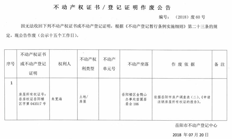 不动产权证书、登记证明作废公告 编号:(2018)废60号