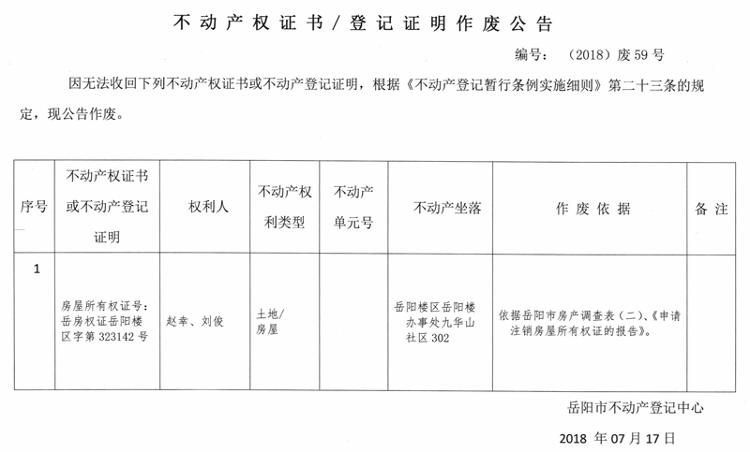 不动产权证书、登记证明作废公告 编号:(2018)废59号