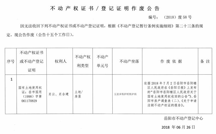 不动产权证书/登记证明作废公告 编号:(2018)废58号