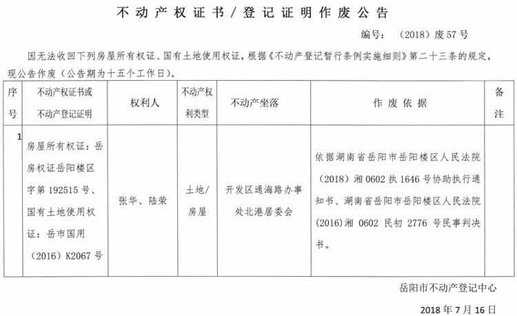 不动产权证书、登记证明作废公告 编号:(2018)废57号