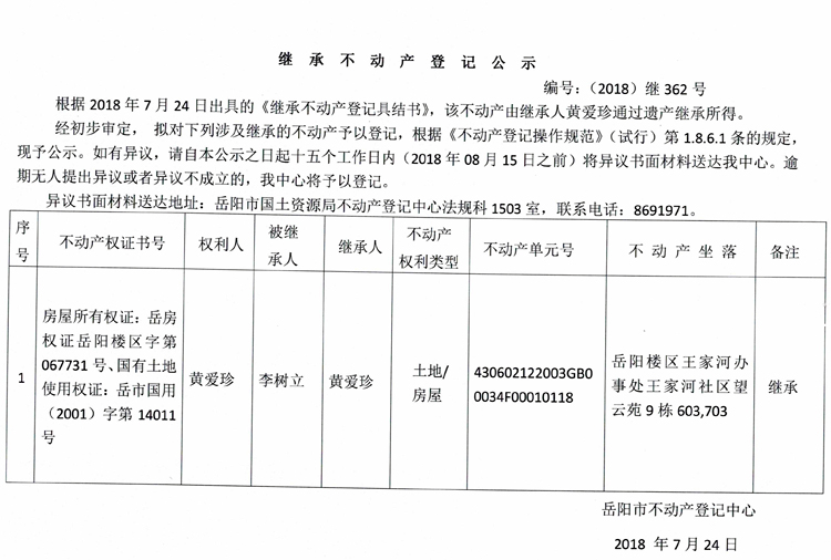继承不动产登记公示 编号:(2018)继362号(黄爱珍)