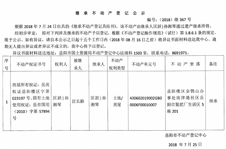 继承不动产登记公示 编号:(2018)继367号