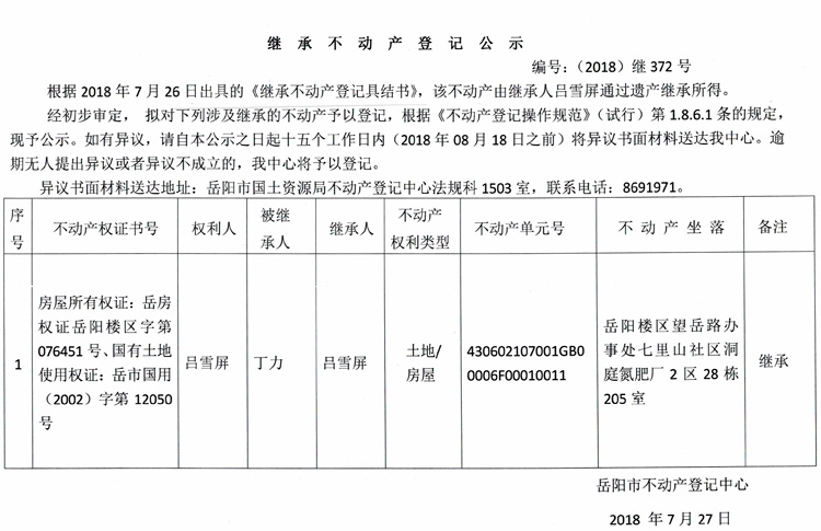 继承不动产登记公示 编号:(2018)继372号