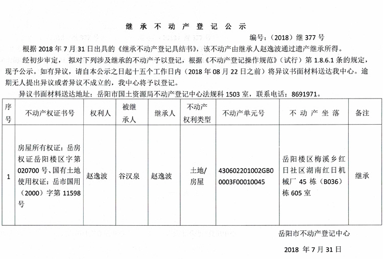 继承不动产登记公示 编号:(2018)继377号