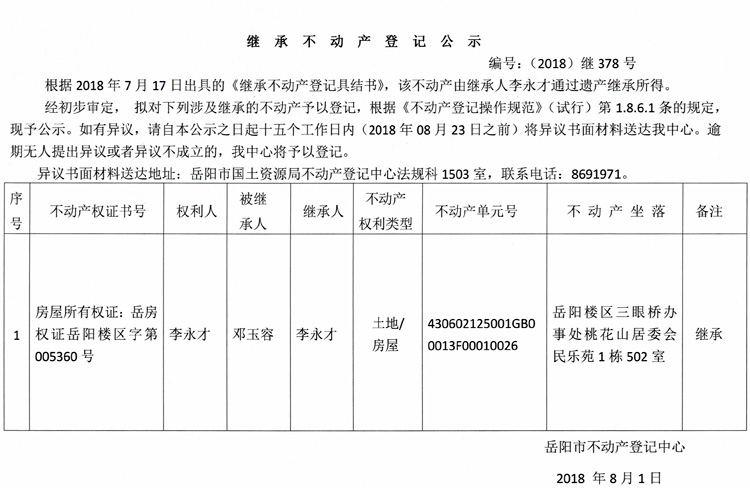 继承不动产登记公示 编号:(2018)继378号