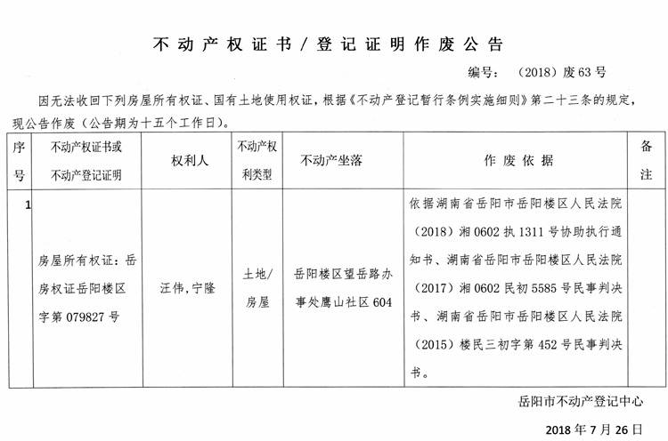 不动产权证书、登记证明作废公告 编号:(2018)废63号