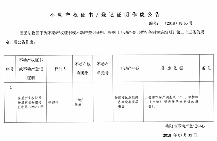 不动产权证书、登记证明作废公告 编号:(2018)废66号