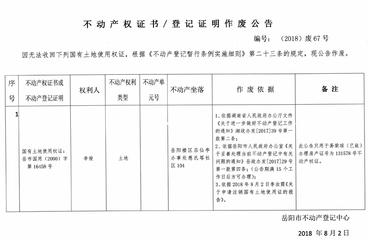 不动产权证书、登记证明作废公告 编号:(2018)废67号