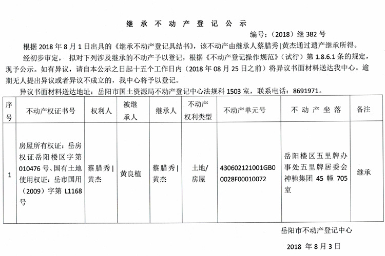 继承不动产登记公示 编号:(2018)继382号