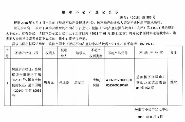 继承不动产登记公示 编号:(2018)继385号