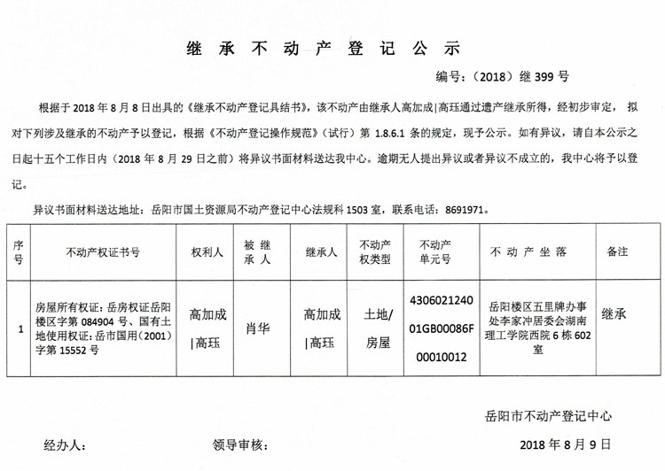 继承不动产登记公示 编号:(2018)继399号