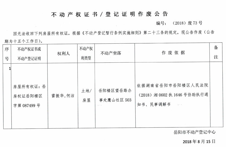 不动产权证书、登记证明作废公告 编号:(2018)废73号