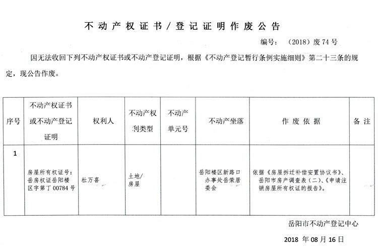 不动产权证书、登记证明作废公告 编号:(2018)废74号