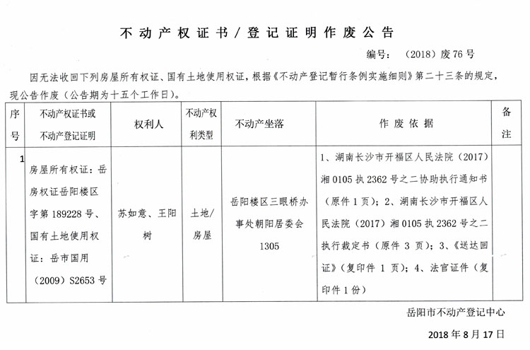 不动产权证书、登记证明作废公告 编号:(2018)废76号