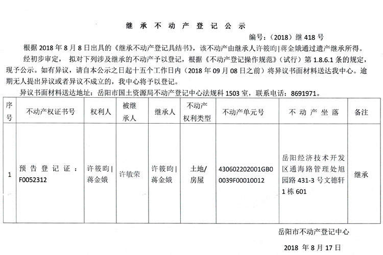 继承不动产登记公示 编号:(2018)继418号
