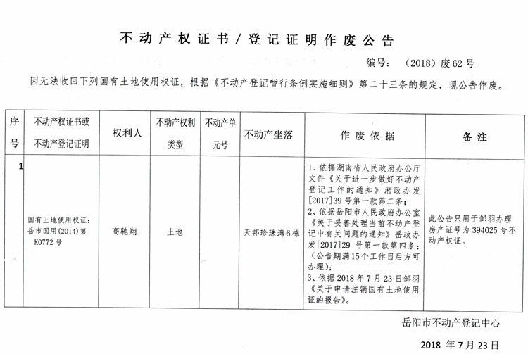 不动产权证书、登记证明作废公告 编号:(2018)废62号