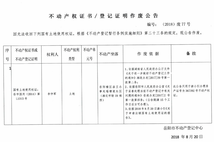 不动产权证书、登记证明作废公告 编号:(2018)废77号