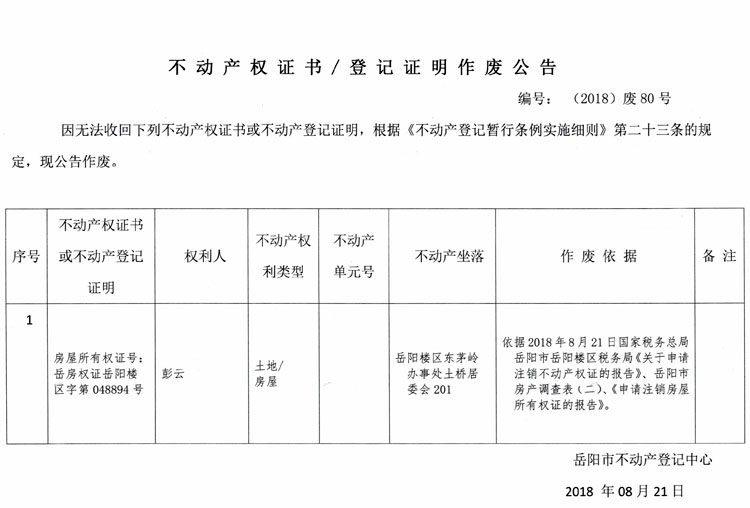 不动产权证书、登记证明作废公告 编号:(2018)废80号