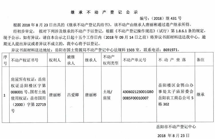 继承不动产登记公示 编号:(2018)继431号