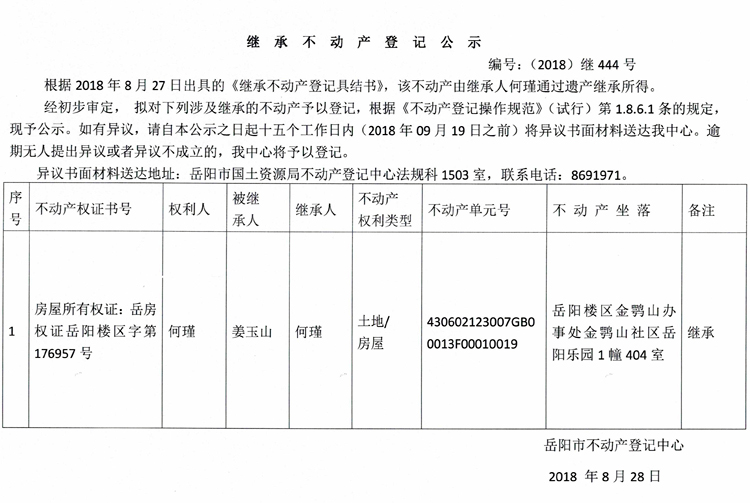 继承不动产登记公示 编号:(2018)继444号(何 瑾)