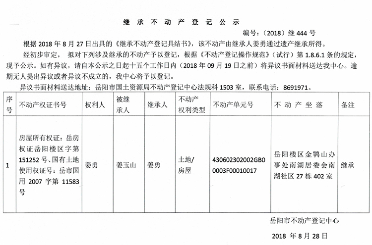 继承不动产登记公示 编号:(2018)继444号(姜勇)