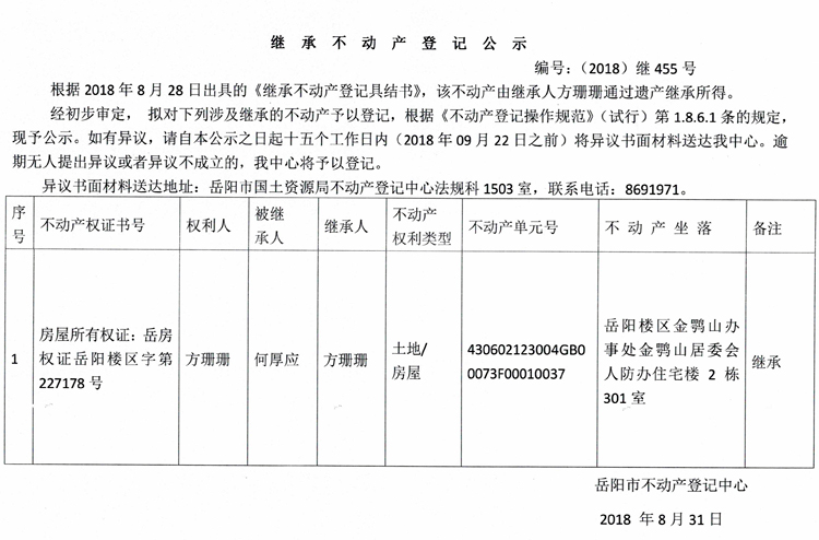 继承不动产登记公示 编号:(2018)继455号