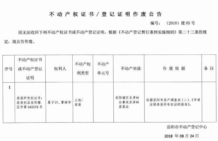 不动产权证书、登记证明作废公告 编号:(2018)废85号