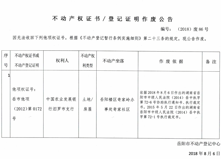 不动产权证书、登记证明作废公告 编号:(2018)废86号